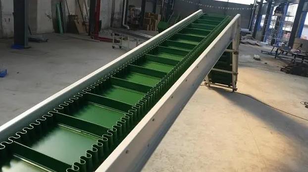 1、帶裙邊的輸送皮帶:裙邊皮帶輸送機的輸送帶的結(jié)構(gòu)形式為中間低的平面皮帶輔以兩邊高的類似裙邊的橡膠帶組合而成,這種設(shè)計,能夠較好的防止物料灑落;其平面皮帶上,通常在一定的間距會有一定高度的橡膠擋板,這種結(jié)構(gòu)能夠很好的將物料輸送到較高位置。